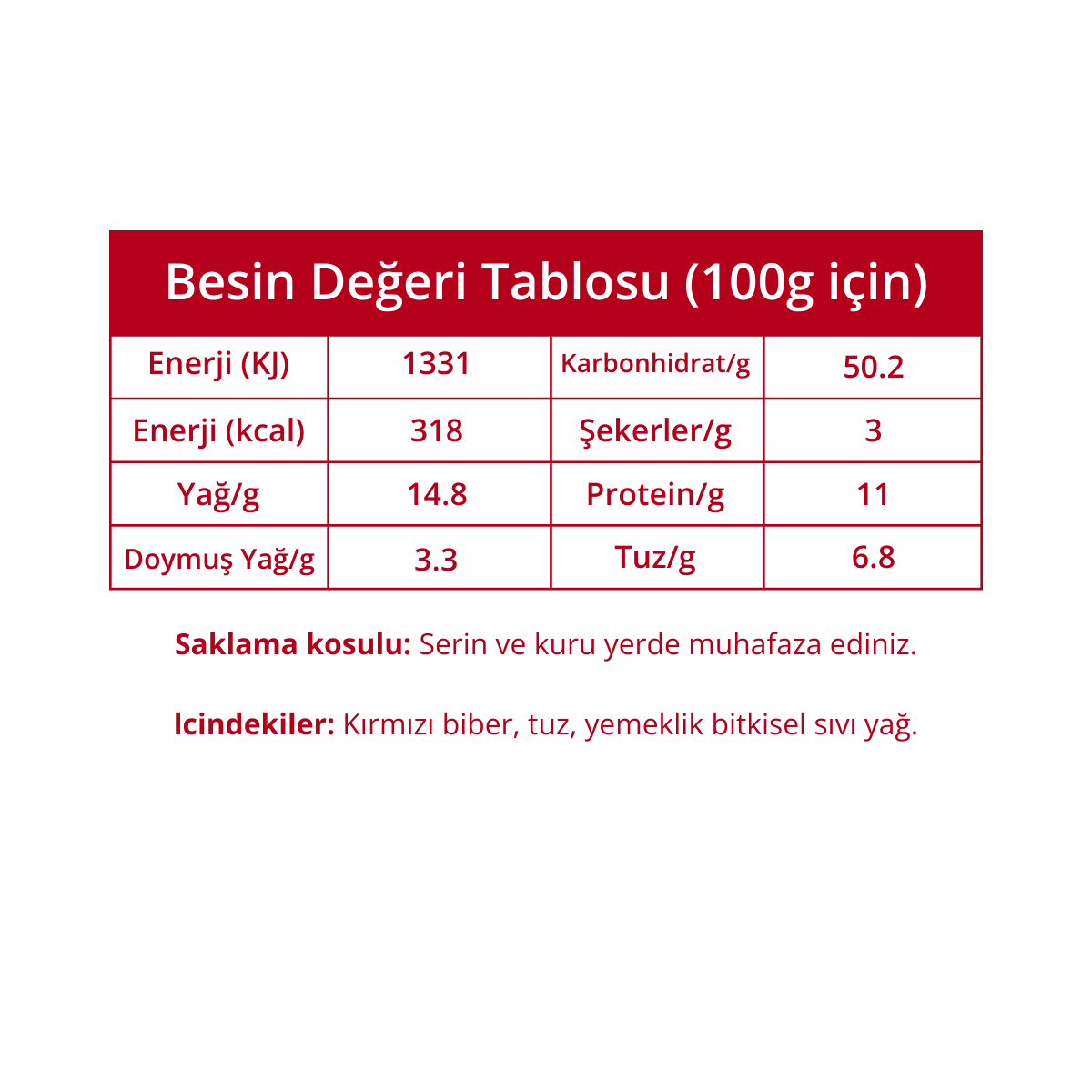🥬 İçindekiler Kırmızı Acı Biber, Tuz, Pamuk Yağı, Ayçiçek Yağı