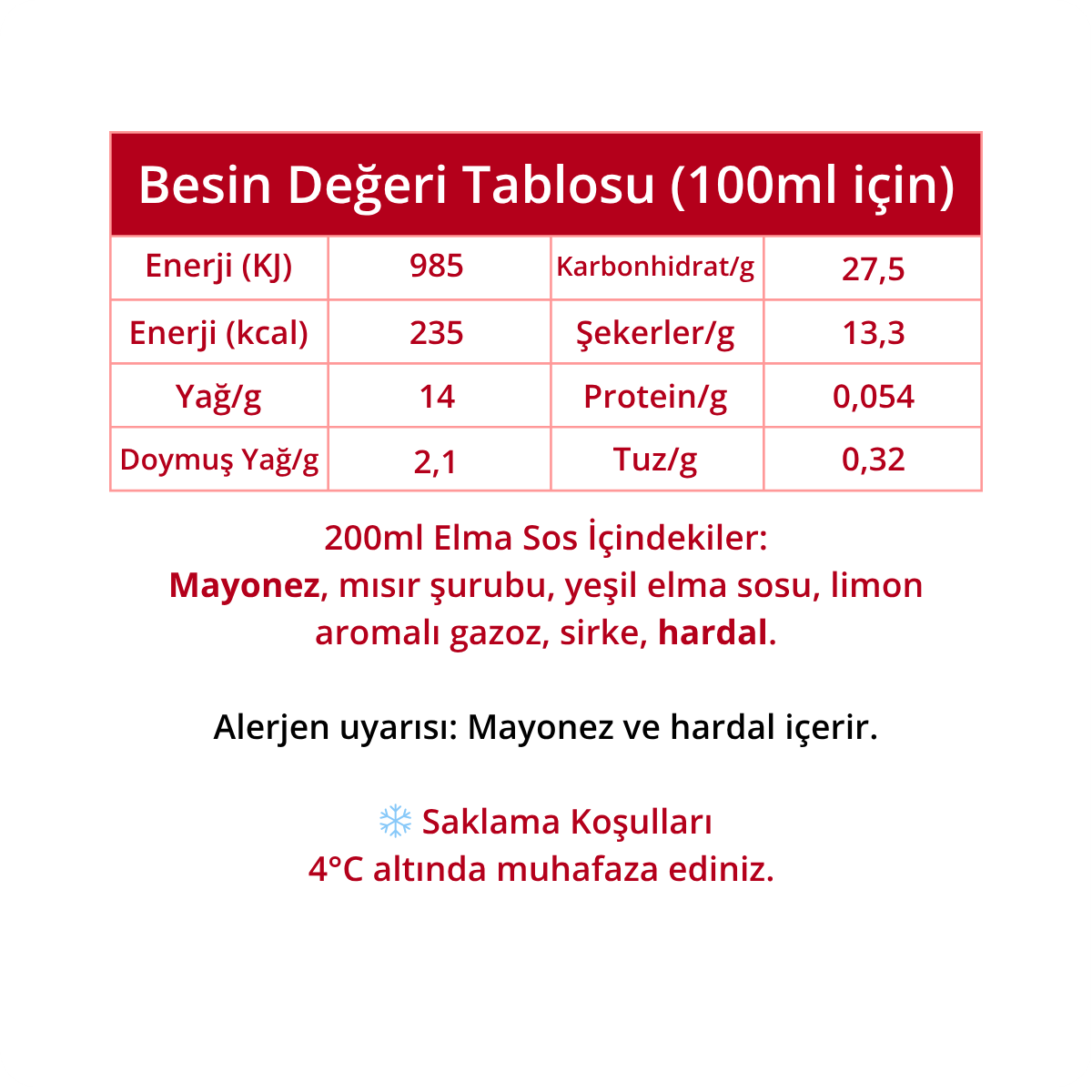 Mayonez, Mısır Şurubu, Yeşil Elma Sosu, Limon Aromalı Gazoz, Sirke, Hardal